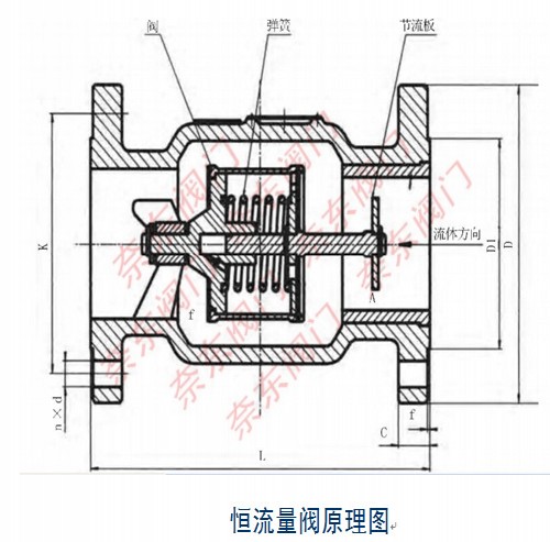 流体进入恒流阀时,通过节流板与流体通道形成的流量节流断面A,在流经阀与出口通道形成的流通节断面f,然后流出恒流阀。流体流经断面A时,节流板正面所受压力与反向弹簧的弹力平衡形成恒流功能。流量增加时节流板受压增加(P加大)并压缩弹簧使阀向出口移动,入口断面A保持不变,而出口断面f减小,使节流板反向压力上升,节流板两端的压差下降(P下降),使节流板在新的位置上保持平衡。这时候节流板两端压差(P)或出口压力不变,根据伯努利方程原理,流量可保持不变,达到恒流作用。